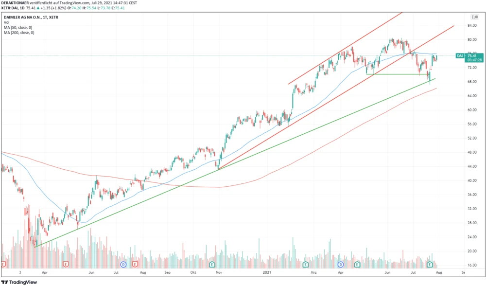 Ende Juni trübte sich das Chartbild der Daimler-Aktie kurzfristig ein. Der seit März 2020 anhaltende Aufwärtstrend, der sich seit November nochmals beschleunigte, geriet ins Stocken. Infolge des Bruchs der Unterstützungslinie bei 76 Euro setzte der Wert erst bis an die 70-Euro-Marke, dann bis an die langfristige Trendlinie bei 68 Euro zurück.
