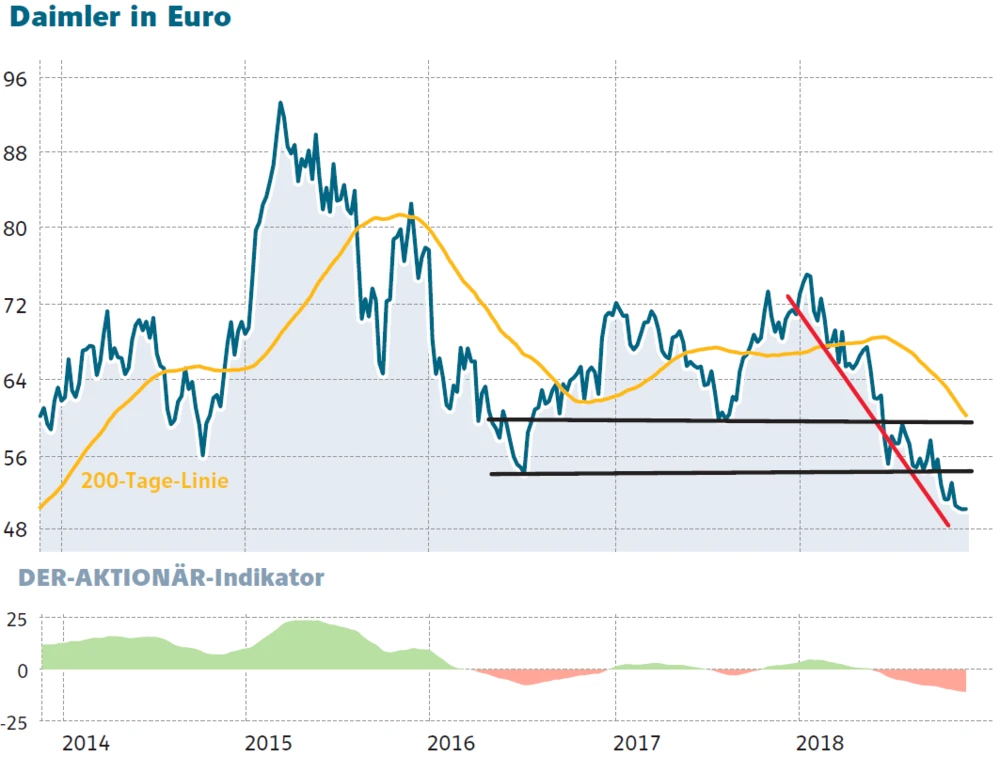 Was die Daimler-Aktie betrifft, so ist diese nach wie vor historisch günstig. Das Papier notiert knapp 20 Prozent unter der wichtigen 200-Tage-Linie. Zuletzt war das im Juli 2016 der Fall. Einen Boden hat die Daimler-Aktie in den letzten Monaten immer wieder um die Marke von 50 Euro gefunden.