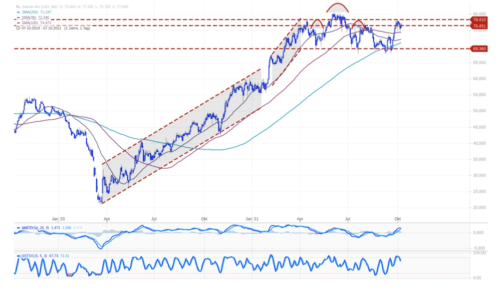 „Erfolgreicher Test der der Schulter-Kopf-Schulter-Formation und bullischer Pullback bis knapp 78 Euro – so oder ähnlich lassen sich die letzten Wochen der Daimler-Aktie beschreiben. Nun steht die Aktie aber schon wieder am Scheideweg. Genau diese 78 Euro-Hürde muss zur Rückkehr in den übergeordneten Aufwärtstrend überwunden werden. Genau das könnte nun kurzfristig nicht so einfach werden. Es besteht zwar positives Momentum, allerdings steht der MACD kurz vor einem Verkaufssignal. Zudem zeigt sich die kurzfristige Slow-Stochastik neutral. So mit „steht und fällt“ die kurz-, mittel- und auch langfristige Entwicklung mit dem „Nadelöhr“ 78 Euro-Hürde“, sagt Charttechnik-Experte Martin Utschneider von Donner & Reuschel.