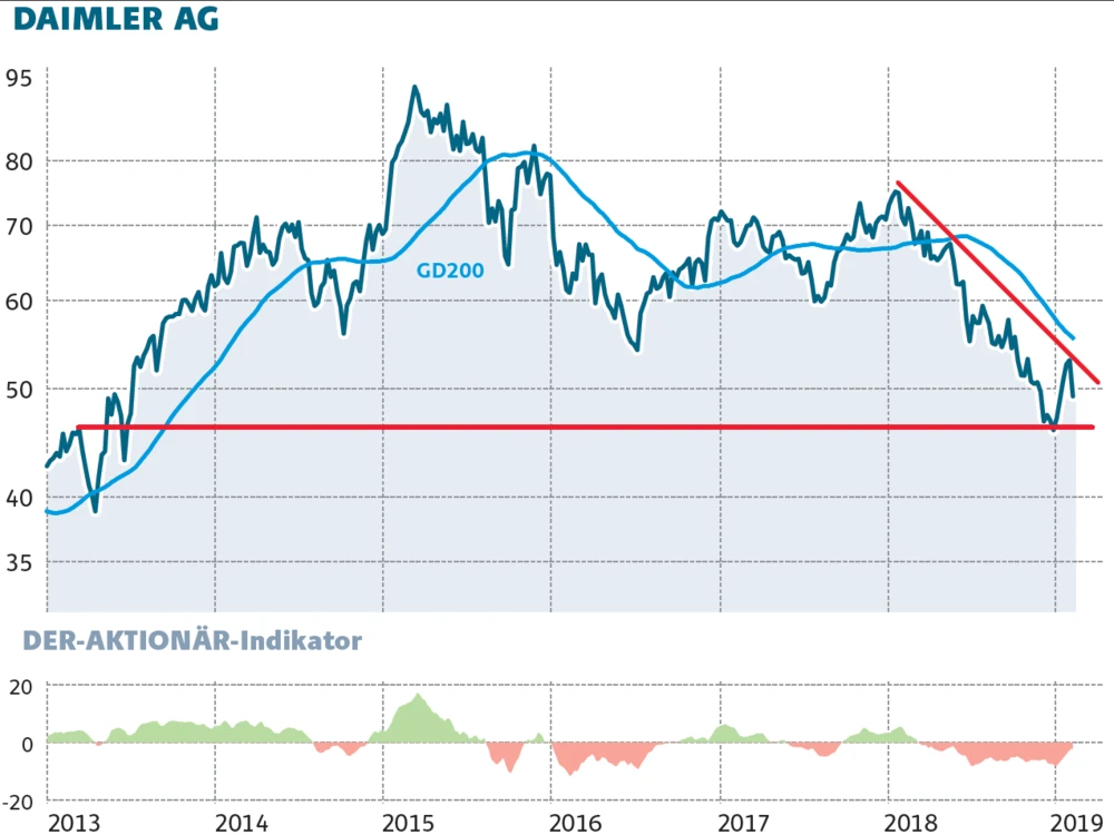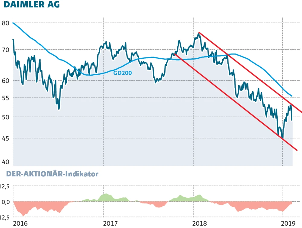 Erst mit dem Sprung über die horizontalen Hürden im Bereich zwischen 53,50 und 54,80 Euro würde sich das Chartbild der Daimler-Aktie wieder aufhellen.