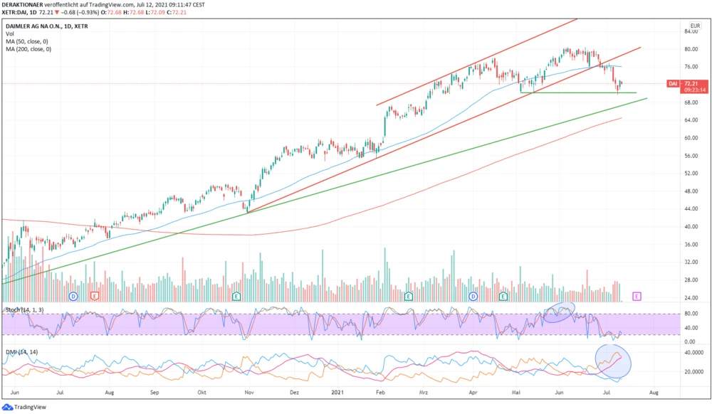Seit November bewegt sich die Daimler-Aktie innerhalb eines steilen Aufwärtskanals. Nachdem sie am 7. Juni ein neues Mehrjahreshoch bei 80,41 Euro markierte, war es mit dem Höhenflug aber vorerst vorbei. Der Wert war deutlich überhitzt (Stochastik-Indikator) und ließ in der darauffolgenden Konsolidierung Dampf ab.