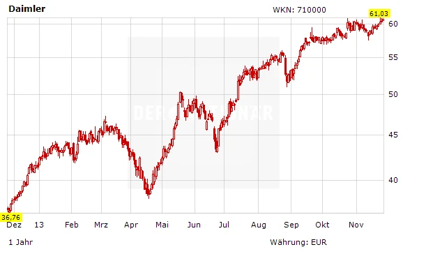 Die Experten des Effecten-Spiegel erklären: Die Volksrepublik China ist der weltgrößte Markt für deutsche Oberklasse-Automobile und Daimler hat dort jüngst einen sehr großen Erfolg erzielt. Die chinesische Regierung genehmigte dem deutschen Konzern als erster ausländischer Firma überhaupt den Kauf von zwölf Prozent von BAIC Motor. Daimler bezahlt 625 Millionen Euro für den Einstieg in die Automobilsparte von BAIC, dem bisherigen Partner in Gemeinschaftsunternehmen. Daimler erhöhte den Anteil an dem Vertriebs-Joint-Venture auf 51 Prozent und der staatliche chinesische Konzern tat das gleiche bei dem Produktions-Joint-Venture. Daimler-Vorstandsvorsitzender Dr. Dieter Zetsche kommentierte: "Mit dieser Investition setzt Daimler ein starkes Zeichen für seine Unterstützung des geplanten Börsengangs von BAIC Motor. Damit werden wir Teil des wachstumsstarken Automobilmarktes in China und einer der wichtigsten Akteure vor Ort." Bei BAIC trägt man sich unterdessen mit dem Gedanken, sich an Daimler zu beteiligen. Daimler erschließt den chinesischen Markt immer weiter: Mitte November erhielt ein auf Nutzfahrzeuge spezialisiertes Gemeinschaftsunternehmen einen Großauftrag über 85 Mercedes-Benz Viano. Zudem wurde in Peking ein Motorenwerk eröffnet. Das Engagement in China wirkt sich bereits positiv auf die Ergebnisse von Daimler aus, wie die Zahlen für das dritte Quartal belegen. Aufgrund des wohl anhaltenden Wachstums sollten Anleger einsteigen. Das Kurspotenzial reicht bis 71 Euro.