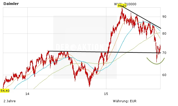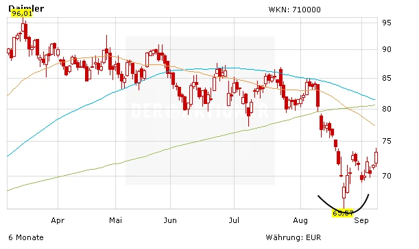 Zugegeben, der Rücksetzer ausgelöst durch die Unsicherheiten um die wirtschaftliche Entwicklung in China hat uns völlig auf dem falschen Fuß erwischt. Auch hat - wie erhofft- die Widerstandslinie bei 80 Euro nicht gehalten. Jetzt gilt es für die Aktie, auf dem aktuellen Niveau einen Boden auszubilden. DER AKTIONÄR bleibt davon überzeugt, dass Daimler die beiden andere Autotitel BMW und VW deutlich hinter sich lassen wird. Voraussetzung dafür ist ein freundlicher Gesamtmarkt. Aktuell sieht es ganz danach aus, als würde sich der Gesamtmarkt so langsam aber sicher aus seiner Umklammerung befreien. Auf dem aktuellen Niveau sind daher erste Käufe bei Daimler wieder vertretbar.