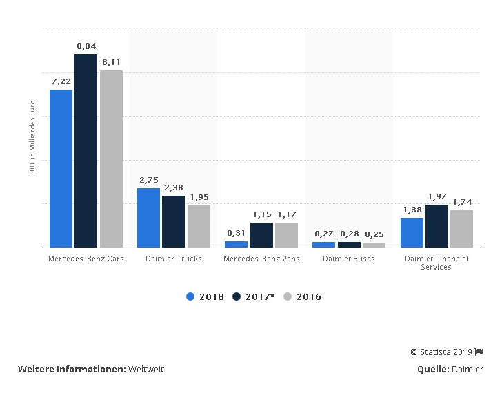 EBIT der Daimler AG in den Jahren 2016 und 2018 nach Geschäftsfeldern (in Milliarden Euro):