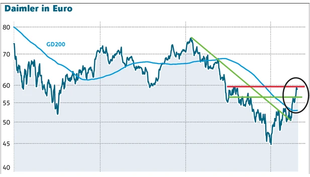 Nach dem starken Move von 50,00 Euro bis auf 59,97 Euro lief die Konsolidierung bis nahezu exakt auf die Ausbruchslinie bei 57,36 Euro (Ausbruchslinie). Die Konsolidierung scheint abgeschlossen. Am Freitag ging es bereits wieder aufwärts. Jetzt gilt es, die Hürde bei 60,38 Euro aus dem Weg zu räumen. Im Anschluss hat die Daimler-Aktie das Potenzial, bis in den Bereich von 63,50 Euro zu klettern. Hier liegt der nächste stärkere Widerstand.