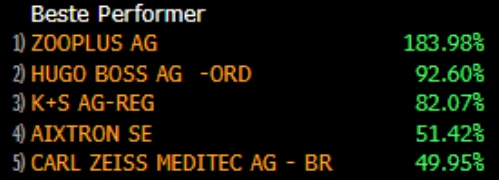 Den MDAX führt der Onlinehändler für Tierbedarf Zooplus mit 184 Prozent deutlich an. Auf den Plätzen folgen mit Hugo Boss sowie K+S zwei starke Comeback-Spekulationen. Hinzu kommen der Hightech-Maschinenbauer Aixtron und der Medizintechnikkonzern Carl Zeiss Meditec.