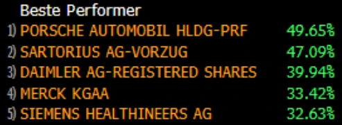 Unter den fünf stärksten DAX-Werten sind drei, die erst durch die Indexerweiterung auf 40 Werte hinzustießen. Dazu zählen die Top-Performer Porsche Holding und Sartorius sowie Siemens Healthineers. Mit Daimler und Merck weisen aber auch zwei etablierte DAX-Konzerne satte Gewinne auf. Für alle fünf Top-Performer stimmen auch die weiteren Aussichten, sie sind laufende Empfehlungen des AKTIONÄR.