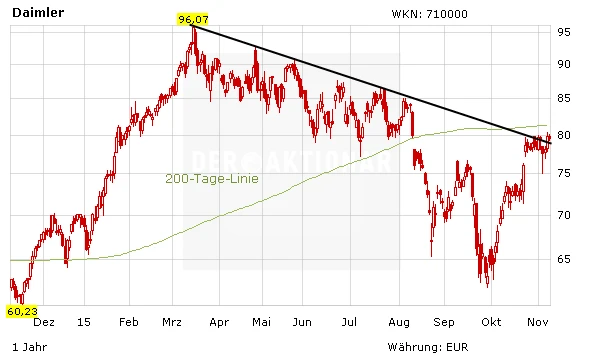 Nicht nur fundamental, sondern auch charttechnisch weiß die Daimler-Aktie zu überzeugen. Den seit März intakten Abwärtstrend hat der DAX-Titel nach oben überwunden. Zudem steht die Aktie kurz davor die 200-Tage-Linie von unten nach oben zu durchreuzen und damit ein Kaufsignal zu generieren.