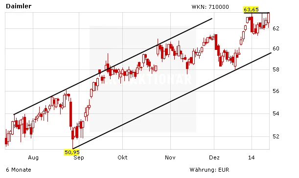 Die Daimler-Aktie steht unmittelbar vor einem neuen Kaufsignal. Am Vortag ist der Wert an das bisherige Hoch bei 63,65 Euro herangelaufen. Bei einem Ausbruch bestätigt die Aktie den Aufwärtstrend und generiert ein neues Kaufsignal. Im Langfristchart ist damit aus technischer Sicht ein Anlauf auf den horizontalen Widerstand bei knapp 79 Euro denkbar. Das Kursziel des AKTIONÄR liegt weiterhin bei 70 Euro.