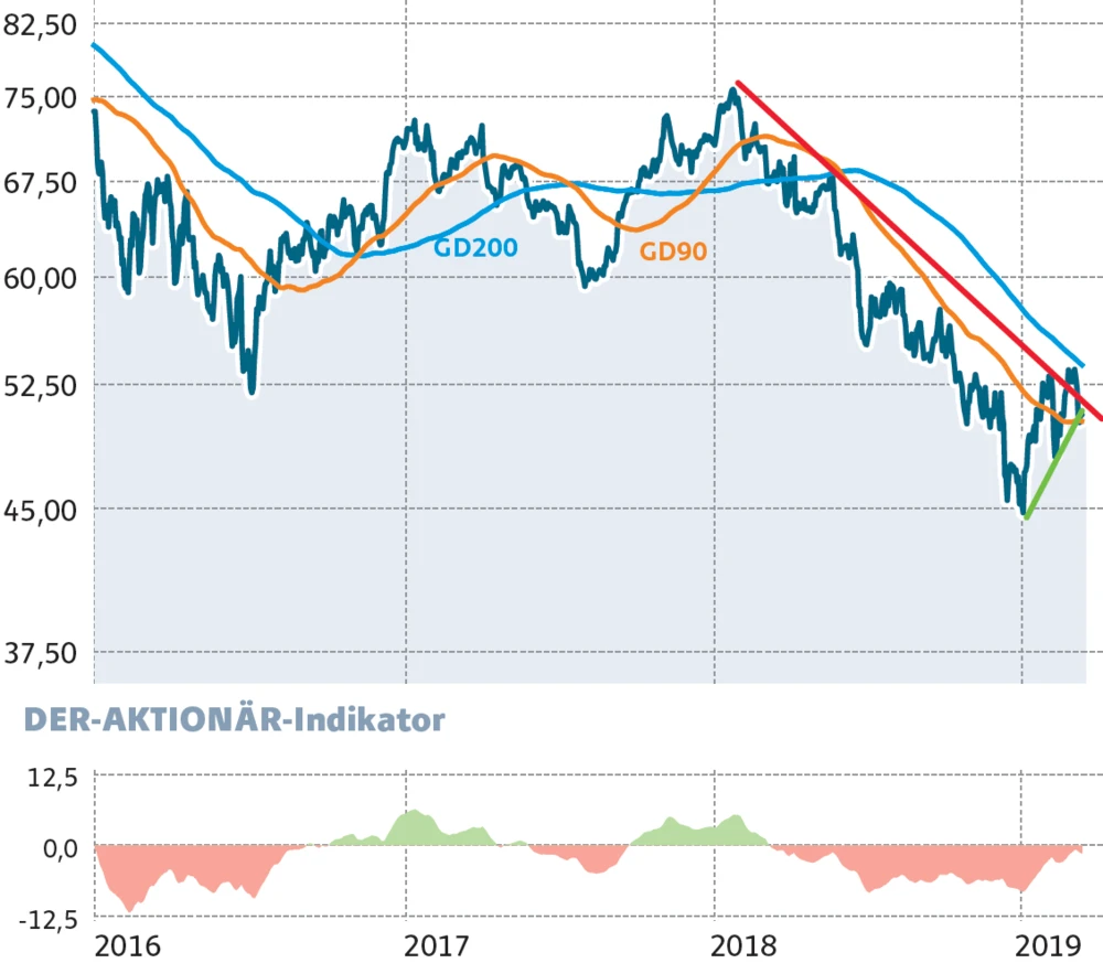 Was die Daimler-Aktie betrifft, so kann noch keine Entwarnung gegeben werden. Das Ppaier des Autobauers kommt nicht richtig vom Fleck. Es fehlt eine neue Vision. An der 200-Tage-Linie ist das Papier zuletzt wieder abgeprallt. Jetzt gilt es die 90-Tage-Linie bei 50,16 Euro zu verteidigen. Abwarten!