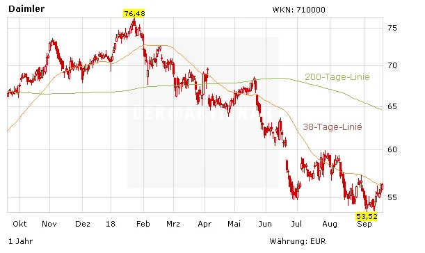 Obwohl sich Daimler dank der Beteiligung an Proterra in dem wichtigen E-Mobilität Markt noch besser positioniert, bleibt die Daimler-Aktie nach wie vor kein Kauf. Das Papier nagt zwar an der 38-Tage-Linie, doch der gleitende 200-Tage-Durchschnitt ist noch mehr als 15 Prozent entfernt. Zudem konnte der Konzern mit den schwachen Absatzzahlen im vergangen Monat nicht überzeugen. Bessere Fundamentaldaten und Abschluss einer Bodenbildung abwarten.
