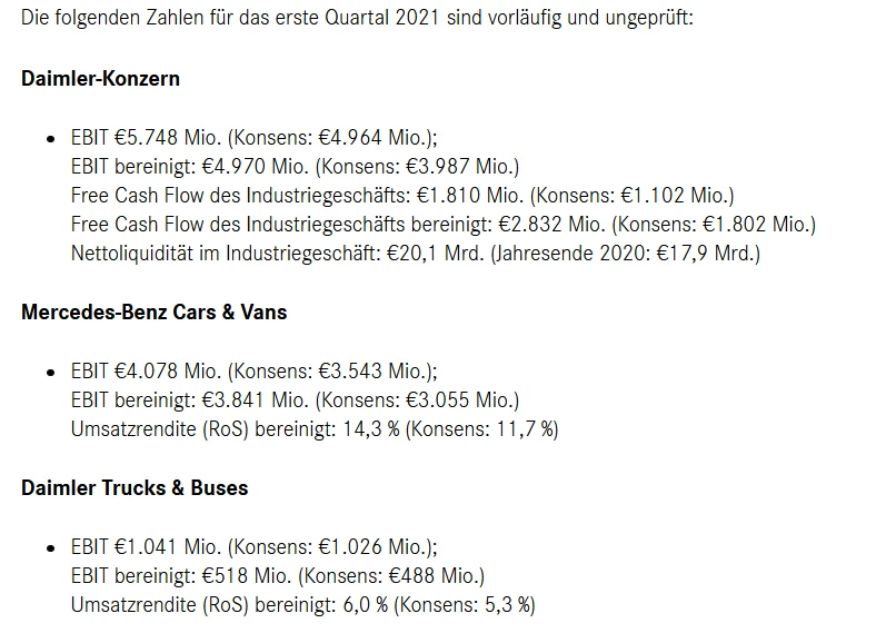 Daimler hat im ersten Quartal 2021 operativ deutlich mehr verdient als Anfang 2020. Der um Sondereffekte wie Erträge aus Übernahmen oder den Kosten für den Konzernumbau bereinigte Gewinn vor Zinsen und Steuern (Ebit) habe im ersten Quartal knapp fünf Milliarden Euro betragen, teilte der Konzern am Freitag auf Basis vorläufiger Zahlen in Stuttgart mit. Experten hatten nach Angaben des Unternehmens knapp vier Milliarden Euro erwartet.