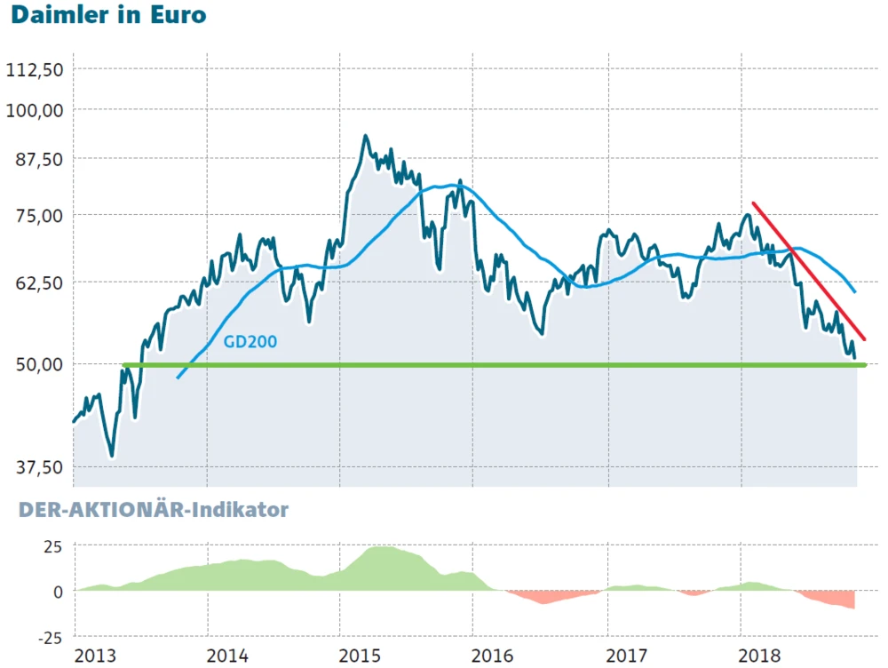 Die Daimler-Aktie notiert im schwachen Marktumfeld weiter unterhalb der wichtigen 200-Tage-Linie bei 60,83 Euro. Der derzeitige Kurs liegt demnach noch immer rund 16 Prozent davon entfernt. Es ist lange her, dass die Aktie derart weit von der 200-Tage-Linie entfernt notierte. Es gilt weiterhin: Abwarten bei Daimler!