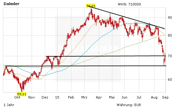 Zugegeben, der China-Schock hat gesessen. Dass die Daimler-Aktie dabei so stark unter die Räder kommt, hätte DER AKTIONÄR nicht für möglich gehalten. Nach dieser satten Korrektur macht es allerdings auf dem aktuellen Niveau keinen Sinn mehr, die Aktie zu verkaufen. Vielmehr ist es jetzt wichtig, gute Einstiegszeitpunkte für die nächsten Wochen auszuloten um einen guten Mischkurs zu bekommen. Aus charttechnischer Sicht sollte die Daimler-Aktie zwischen 68 Euro und 72 Euro einen Boden ausbilden.