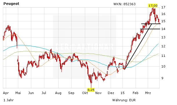 Zwar ist die Peugeot-Aktie schon gut gelaufen, jedoch lässt die aktuelle Bewertung noch immer Luft nach oben zu. An der Börse ist Peugeot derzeit knapp 12 Milliarden Euro schwer, bei einem Umsatz von 55 Milliarden Euro. Das macht ein Kurs-Umsatz-Verhältnis (KUV) von 0,2. Zum Vergleich: Andere Autobauer werden mit einem KUV zwischen 0,5 und 0,8 gehandelt. Das Papier hat noch immer Nachholpotenzial. Anleger versuchen zwischen 14 und 14,50 Euro einne Fuß in die Tür zu stellen.