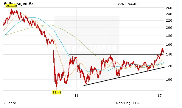 VW kämpft nach wie vor mit den Nachwirkungen des Abgas-Skandals. Wie in den letzten Wochen immer wieder betont, sollten Anleger das als „Begleitmusik“ hinnehmen, mehr aber auch nicht. Die Börse hat das Diesel-Dilemma längst abgehakt und blickt nach vorne. Jetzt muss VW versuchen in Sachen Elektromobilität zu punkten. Hier hängt man weit hinter Daimler und BMW zurück. Die Aktie hat knapp unter der 38-Tage-Linie wieder nach oben gedreht. Anleger bleiben investiert. Das Kursziel bleibt bei 171 Euro.