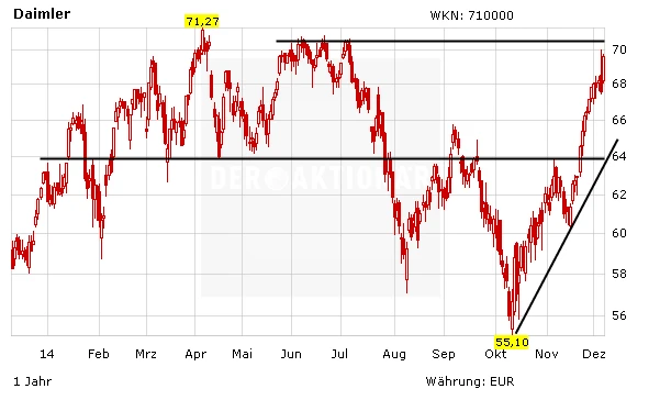 Aus charttechnischer Sicht hat die Daimler-Aktie in den letzten Wochen eine beeindruckende Rallye hingelegt. Seit dem Verlaufstief im Oktober hat der Wert fast 30 Prozent zugelegt und notiert derzeit vor dem Widerstand bei 70 Euro. Auf dem aktuellen Niveau wäre nun eine Korrektur durchaus denkbar. Eine Unterstützung findet sich im Bereich von 64 Euro. Im Anschluss könnte die Aktie genügend Power entwickeln, um über das Jahreshoch bei 71,27 Euro zu klettern.