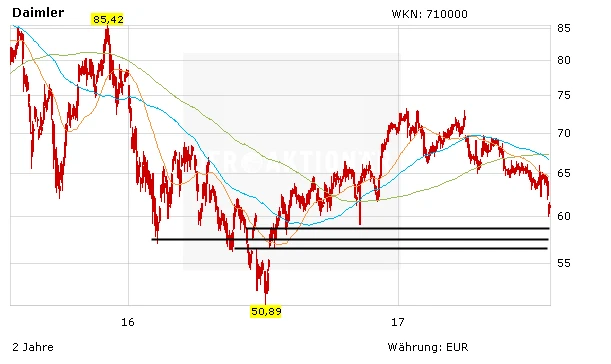Bei der Daimler-Aktie ist das Verkaufssignal weiter intakt, was durch den Bruch der viel beachteten 200-Tage-Linie entstand. Nach kurzem Aufbäumen konnte sich Daimler allerdings nicht mehr besser als der DAX entwickeln. Der Abverkauf mündete am Dienstag in eine leichte Erholung. Die Daimler-Aktie traf dabei auf mehrere starke Unterstützungen im Bereich zwischen 60,00 Euro und 56,50 Euro. Für Trader kommt auf diesem Niveau eine kleine Position durchaus