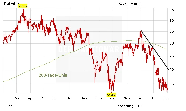 Auch wenn die Daimler-Aktie auf dem aktuellen Kursniveau hochattraktiv ist – die Experten erwarten im Schnitt eine Dividende von 3,11 Euro (Vorjahr: 2,45 Euro) je Aktie – und die Analysten deutlich höherer Kurse für möglich halten, sollten Anleger den in Ausgabe 03/15 neben dem Kauflimit empfohlenen Stoppkurs bei 58,00 Euro beachten.