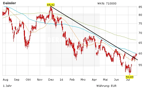 Spekulativ kaufenswert ist auch Daimler. Allerdings eher aus charttechnischen Gesichtspunkten. Das Papier ist vor wenigen Tagen aus dem Abwärtstrend ausgebrochen. Bestätigt sich der Trend, kann die Position prozyklisch ausgebaut werden.