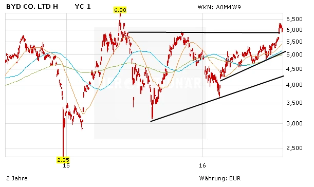 Die Aktie von FiatChrysler ist weiterhin keine Spekulation wert. Spannung versprechen dagegen die Papiere von BYD. Über 50 Prozent hat die Aktie des chinesischen Elektroautobauers seit Anfang Februar zugelegt. Eine beeindruckende Entwicklung. Vor wenigen Tagen wurde bekannt, dass sich Samsung eingekauft hat. Was die Aktie betrifft, so ist eine Konsolidierung bis auf 5,80 Euro durchaus möglich. Auf diesem Niveau bietet sich dann sogar ein Neueinstieg an.