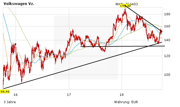 Um sich einen modernen Anstrich zu verpassen, kauft sich VW bei vielen High-Tech Start Ups ein, gründet selbst neue Firmen wie zum Beispiel die Gebrauchtwagenplattform Heycar oder den Mitfahrdienst Moia. Zuletzt hat VW eine Kooperation mit dem Tech-Giganten Microsoft eingetütet. Ab 2020 an sollen jedes Jahr mehr als fünf Millionen neue VW-Autos voll vernetzt auf den Markt kommen. Bei der Aktie heißt es dennoch: Abwarten.