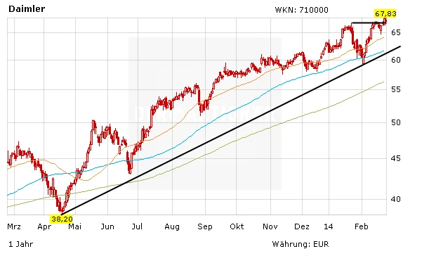 Unterstützen wird die weitere Aufwärtsbewegung der Aktie die Modelloffensive von Daimler im laufenden Jahr. Am 15. März kommt der neue Geländewagen GLA in den Handel. Für Daimler ein interessantes Segment: Hier haben in der Vergangenheit vor allem Audi und BMW fleißig gepunktet. Auf dem Autosalon in Genf (6. bis 16. März) wird das S-Klasse Coupé der Öffentlichkeit präsentiert. Ein Facelift gibt es 2014 noch beim CLS und der B-Klasse. Zudem bleiben die Voraussetzungen für den weltweiten Automarkt gut. "Der Welt-Pkw-Markt wächst im Jahr 2014 um fünf Prozent oder 3,56 Millionen Neuwagen auf 74,2 Millionen Fahrzeugverkäufe. Größter Wachstumstreiber ist der Markt China mit einem Zuwachs von elf Prozent oder 1,74 Millionen Neuwagen. Mit einem Anteil von knapp 50 Prozent am weltweiten Wachstum ist China im Jahre 2014 die Lokomotive der Autoindustrie", sagt Ferdinand Dudenhöffer vom CAR-Institut.