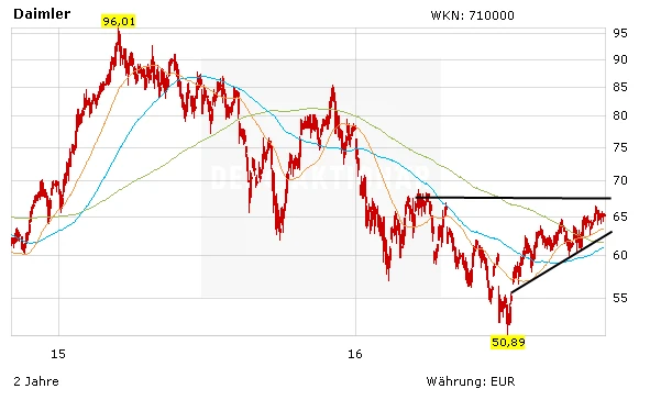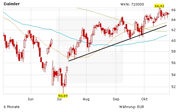 Die Daimler-Aktie macht derzeit einen guten Eindruck .DER AKITONÄR ist und bleibt überzeugt: Daimler wird den Wandel hin zum Mobilitätskonzern stemmen. Die Zahlen letzten waren gut, der Ausblick weniger. Vorstand Zetsche reduzierte seine Umsatzerwartungen leicht nach unten. Grund ist die Annahme, dass der US-Markt leicht zurückgehen werde. Die Daimler-Aktie tauchte daraufhin kurz bis unter 64,00 Euro ab. Das Papier erholte sich jedoch schnell wieder und kletterte bis aktuell 65,25 Euro nach oben. Kurzfristige Rücksetzer bis in den Bereich der unteren Begrenzung des Aufwärtstrendkanals bei 62,76 Euro sollten Anleger nicht aus der Ruhe bringen.