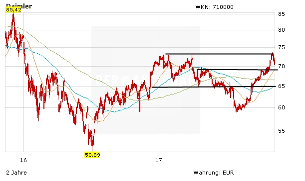 Die Daimler-Aktie hat sich lange geziert. Vor wenigen Tagen ist das Papier dann endlich über die Marke von 70 Euro ausgebrochen. Woher kommt auf einmal die gute Stimmung für Daimler, BMW und VW? Es scheint so, als würden die Investoren das klare Bekenntnis der Autobauer zur Elektromobilität, zu neuen Konzepten begrüßen. Dafür nehmen die Anleger auch geringere Gewinne in den nächsten Jahren in Kauf. Eine Konsolidierung der Daimler-Aktie bis in den Bereich zwischen 68,00 Euro und 69,50 Euro wäre denkbar. In einem freundlichen Gesamtmarkt muss das Daimler-Papier dann den hartnäckigen Widerstand bei 72,50 Euro knacken, dann sind 80 Euro drin.