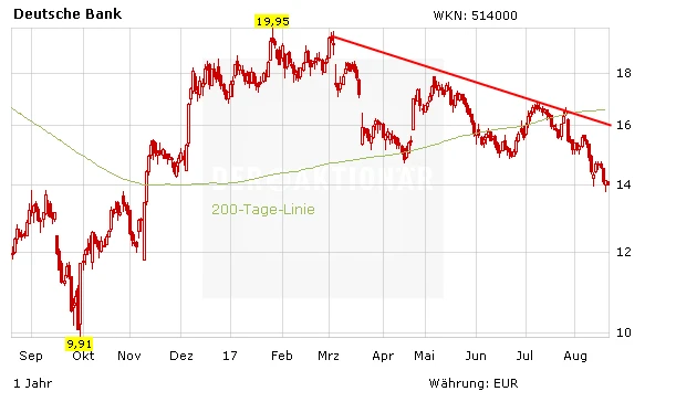 Der Chart der Deutsche-Bank-Aktie bleibt eingetrübt. Der Kurs hat sich zuletzt immer weiter von der 200-Tage-Linie bei 15,73 Euro entfernt und steht jetzt kurz vor der Unterstützung bei 13,93 Euro. Diese Marke überschritt der Kurs im vergangenen November, als eine Einigung im US-Hypothekenstreit in Reichweite rückte. Aus psychologischer Sicht wäre es wichtig, dass diese Zone hält. Aufhellen würde sich der Chart erst wieder, wenn der Widerstand bei 14,86 Euro nachhaltig geknackt werden könnte. Eine Trendumkehr ist erst zu erwarten, wenn der mittelfristige Abwärtstrend um 16,28 Euro nachhaltig nach oben durchbrochen wird.