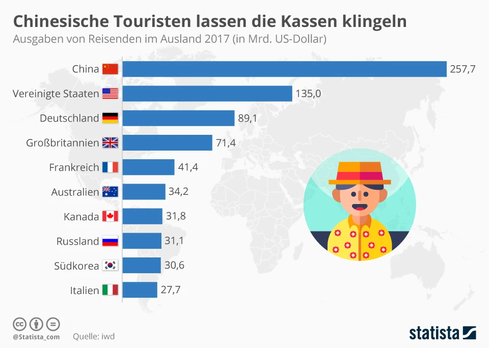 Der Grund: Die Chinesen sind nicht nur reisefreudig, sondern geben im Urlaub auch jede Menge Geld aus. Auf Grundlage von Daten der Welttourismusorganisation hat das Institut der deutschen Wirtschaft (iwd) berechnet, dass Chinesen im vergangenen Jahr 257,7 Milliarden Dollar im Ausland ausgegeben haben – einen guten Teil davon auch hierzulande, denn Deutschland steht bei Chinesen als Reiseziel hoch im Kurs. Die Welttourismusorganisation hat im Jahr 2017 über 2,7 Millionen Übernachtungen chinesischer Reisender in Deutschland gezählt.