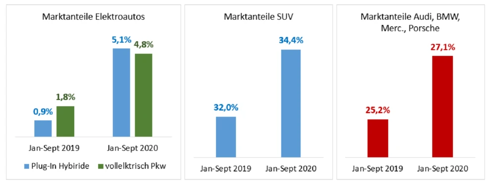 Überraschung: Die Marktanteile von Elektroautos, SUV und den deutschen Premiummarken (Audi, BMW, Mercedes, Porsche) sind in diesem Jahr deutlich gestiegen. Trotz Corona-Krise kaufen die deutschen gerne „hochwertiger“.