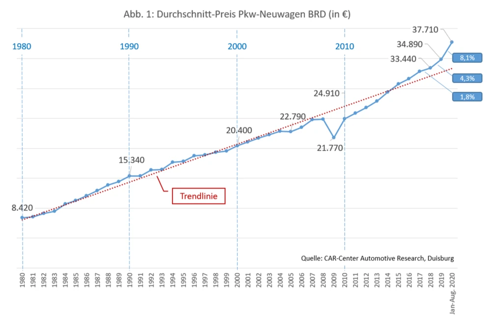 Doch die neuesten Zahlen sprechen eine ganz andere Sprache. Prof. Dr. Ferdinand Dudenhöffer vom Center Automotive Research berichtet: „In den ersten acht Monaten des Jahres ist der Listenpreis, des in Deutschland verkauften Neuwagens um 8,1 Prozent auf 37.710 Euro gestiegen.“ Die deutschen Autokäufer würden bessere, schönere, umweltfreundlichere lieben Autos. Der Experte stellt klar: „Der vielbesungene Abschied vom Auto ist eher eine weniger realistische Behauptung.“