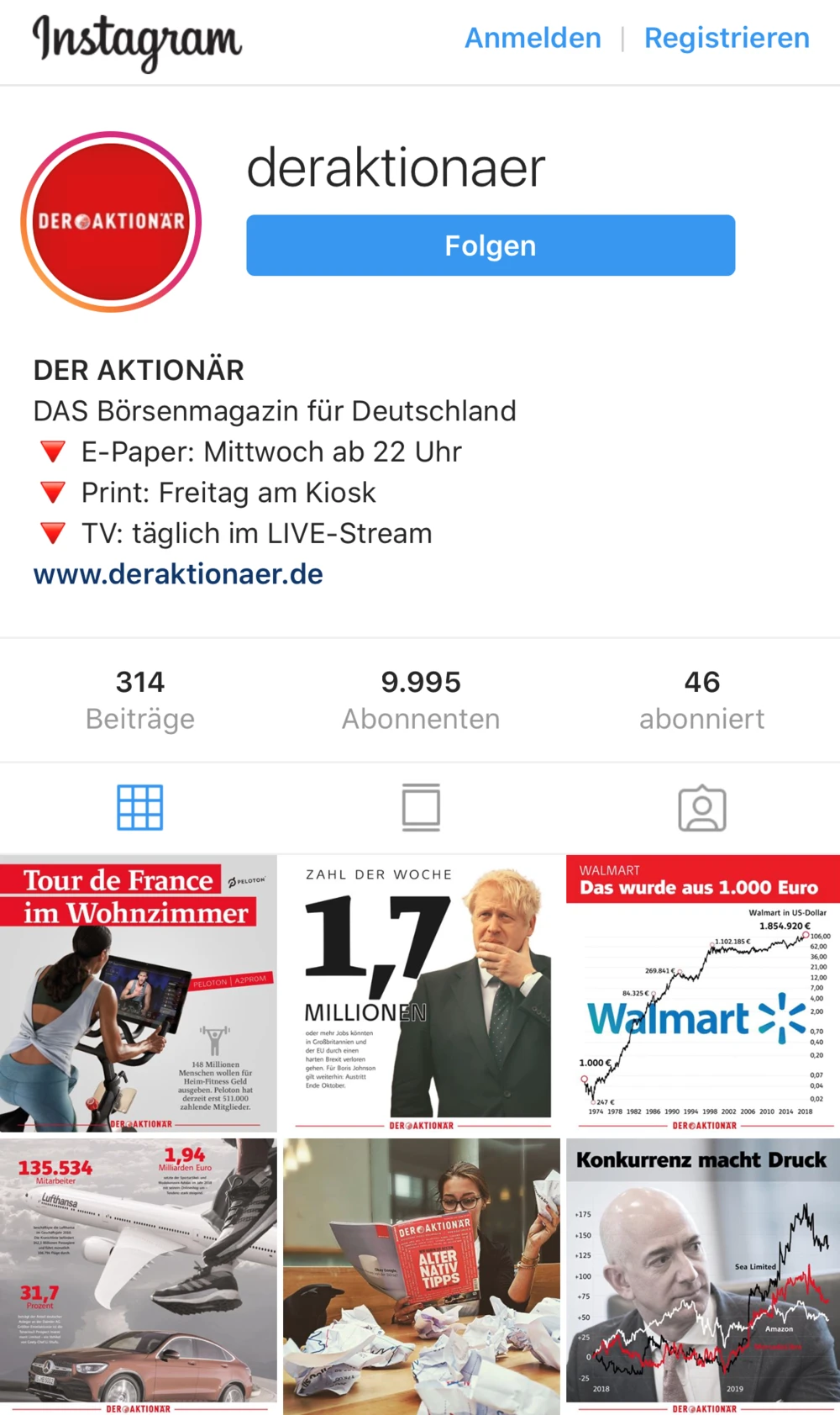 Dazu kommen alle Termine, in denen unsere Leser die Redakteure live erleben können, die Gelegenheit, Artikel zu kommentieren und mit der Community zu diskutieren, Umfragen, die wöchentliche Vorabankündigung der Titelstory des Magazins usw. Jede Menge relevanter News und Features. Nur einen Klick entfernt. Abonnieren Sie jetzt DER AKTIONÄR auf Instagram.