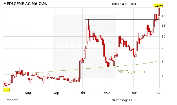 Die deutschen Biotech-Werte können einen gelungenen Jahresstart feiern. Insbesondere die im TecDAX notierten Aktien von Evotec, Medigene und Morphosys legen kräftig zu. Unangefochtener Spitzenreiter ist am Montag Medigene mit einem Kursplus von 8,7 Prozent. Die Aktie kennt seit dem Bekanntwerden des Wiederaufstiegs in den deutschen Technologiewerte-Index nahezu kein Halten mehr. Zum Jahresende 2016 erst gelang der Sprung über den wichtigen Widerstand bei 11,63 Euro und damit ein neues Kaufsignal.