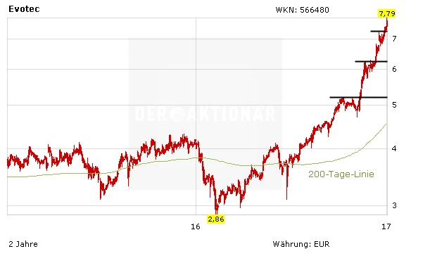 Und auch Evotec gehört zu den stärksten TecDAX-Werten des Tages. 3,1 Prozent auf 7,69 Euro gewinnt die Aktie hinzu. Damit setzt Evotec die enorm starke Entwicklung des Vorjahres nahtlos fort. 2016 hat der Wert auf Platz zwei der besten TecDAX-Titel abgeschlossen. Im vergangenen Jahr konnte man zahlreiche neue Kooperationen mit renommierten Pharma- und Biotech-Firmen (unter anderem mit Bayer und Celgene) abschließen und darüber hinaus viele Meilensteinzahlungen generieren. Demnächst ist Evotec gleich auf drei Investorenkonferenzen präsent. Das Unternehmen wird auf der 16th German Corporate Conference 2017 in Frankfurt (18. Januar) präsentieren und an dem 20th ODDO Forum (5. Januar) in Lyon, Frankreich, sowie der 35th Annual J.P. Morgan Healthcare Conference (9. Bis 12 Januar) in San Francisco, USA, teilnehmen.