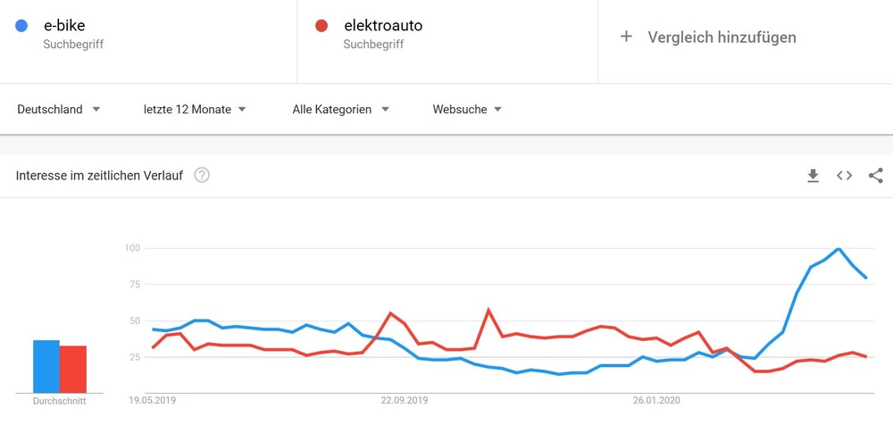 Besonders elektrische „Tesla-Fahrräder“ sind gefragt. Google-Trends zeigt: Das Interesse an mit Batterie betriebenen E-Bikes schnellt in diesen Tagen mehr nach oben als das nach Elektroautos.