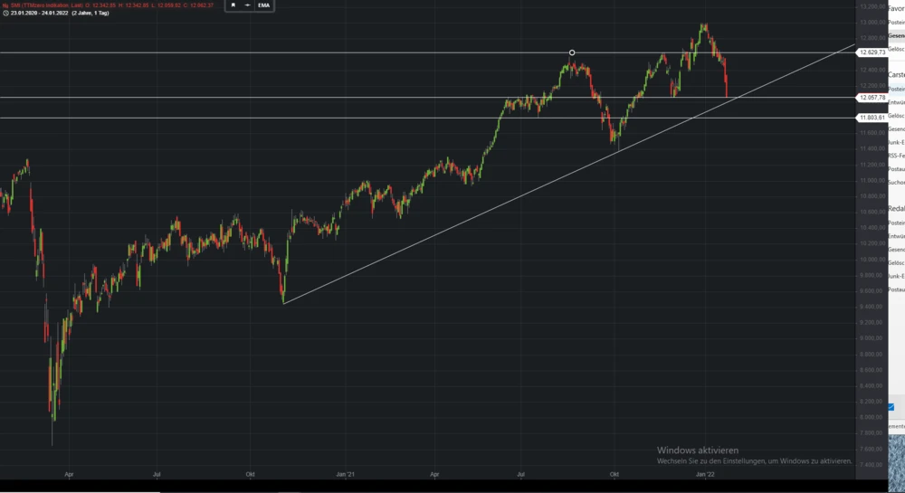 Von da aus ging es steil nach oben und am 4. Januar 2022 markierte der SMI seinen bisherigen Rekordwert in Form eines Verlaufshochs bei 13.001 Punkten. Mit dem jüngsten Rutsch bis in den Bereich des langfristigen Aufwärtstrends bei 12.020 bis 12.030 Punkten ist die Welt derzeit (gerade) noch in Ordnung.