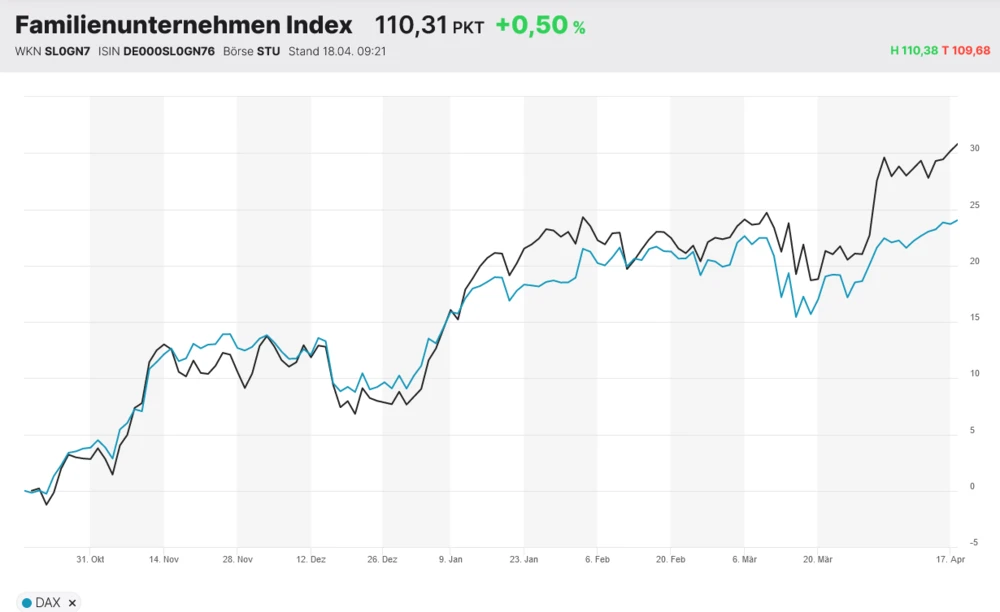 Der Investment-Ansatz auf Familien-Unternehmen zu setzen scheint zu greifen. Auf Sicht von einem halben Jahr konnte DER AKTIONÄR Familienunternehmen Index den DAX-40 um sechs Prozent outperformen. Aus Fünf-Jahres-Sicht hätte der Index den DAX40 knapp 25 Prozent hinter sich gelassen. Mit dem Indexzertifikat WKN DA0ABS können Anleger an der Kursentwicklung von zwölf Familien geführten Unternehmen teilhaben.