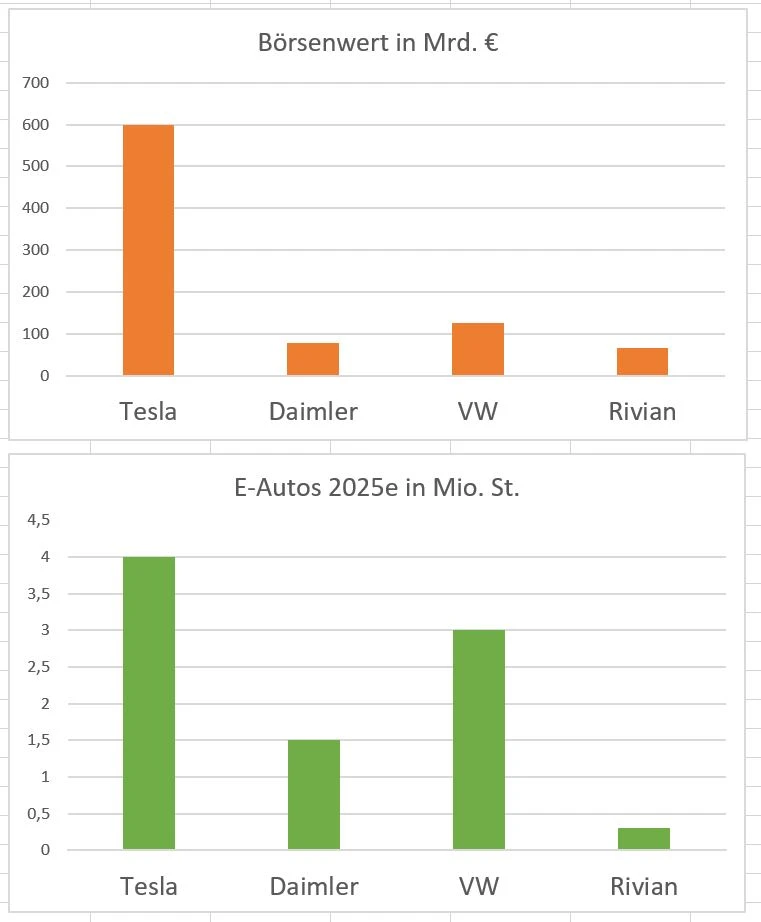 Tatsächlich hat Rivian noch kein Auto verkauft, will mit seinen 2.000 Mitarbeitern jedoch fast so viel wert sein, wie Daimler mit rund 280.000 Angestellten, wie folgende Grafik zeigt.