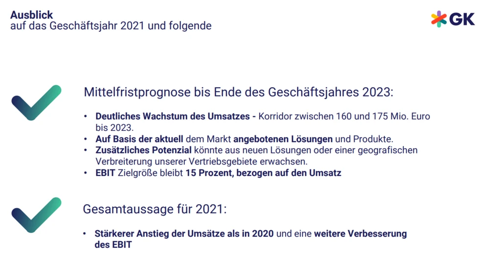 Auch nach neun Monaten hat GK Software den Wachstumskurs erfolgreich fortgesetzt. Die Zahen zeigen aber auch, dass die Software aus der Cloud immer beliebter wird. Dieser Trend führt zu höheren Margen und zu einer steigenden Visibilität. Vor dem Hintergrund des bisherigen Verlaufs des Geschäftsjahres bestätigt der Vorstand seine Prognose für 2021 sowie die mittelfristige Prognose bis 2023.