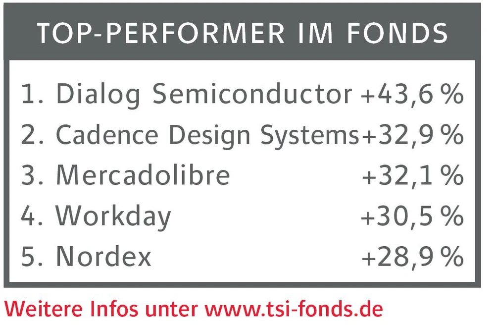 Neben dem Windkraftanlagenhersteller Nordex finden sich unter den Top-Aktien des TSI-Fonds vor allem US-Werte wie Workday, Mercadolibre und Cadence Design Systems. Einzig auf der Pole Position findet sich noch ein heimischer Wert. Dialog Semiconductor konnte in den letzten Wochen den Performanceturbo starten und so sein Plus seit Aufnahme in den Fonds auf über 43 Prozent steigern.