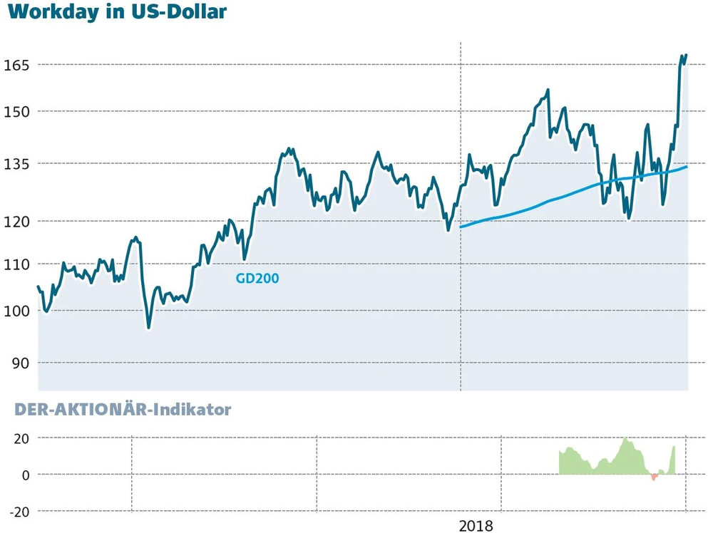 Im dritten Quartal konnte das Unternehmen den Umsatz um über 33 Prozent auf 743 Millionen Dollar im Vergleich zum Vorjahreszeitraum steigern. Der bereinigte Gewinn kletterte damit auf über 73 Millionen Dollar, was einer Verdopplung entspricht. Aber auch der Ausblick überzeugt. Für das kommende Geschäftsjahr erwartet Workday einen Umsatz von rund drei Milliarden Dollar – ein Wachstum von über 26 Prozent.
