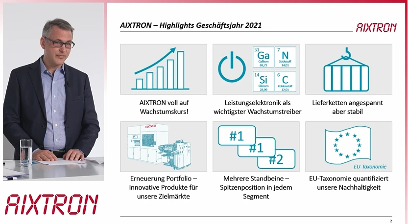 „Die hocheffiziente Leistungselektronik auf Basis von Galliumnitrid hat in den letzten beiden Jahren den kommerziellen Durchbruch geschafft“, erklärt Vorstand Felix Grawert auf der virtuellen Hauptversammlung. „Sie wird immer leistungsfähiger und bahnt sich in rasantem Tempo ihren Weg in immer weitere Anwendungsbereiche.“