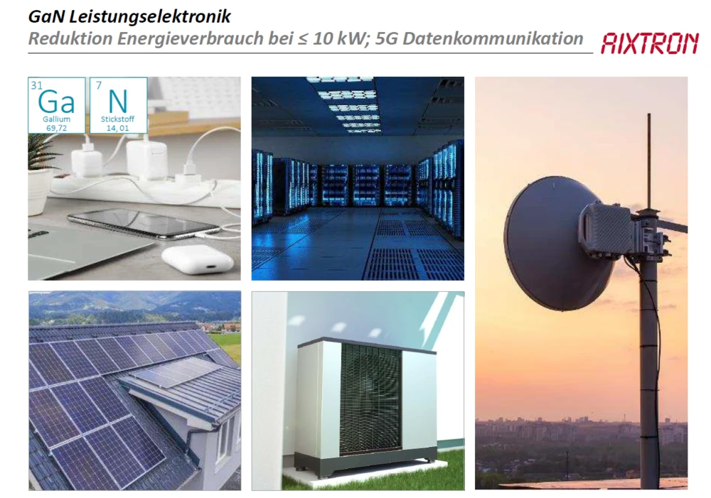 Aixtron liefert mittlerweile auch Anlagen zur Herstellung von Halbleiterbauelementen auf Basis von Galliumnitrid (GaN) und Siliciumcarbid (SiC) und ist damit ein wichtiger Wegbereiter für die weltweit zunehmende Elektrifizierung und die Reduktion des Stromverbrauches mittels energieeffizienter Leistungselektronik.