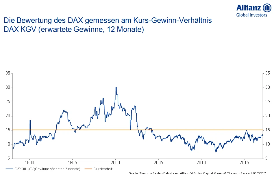 „Der DAX nähert sich zwar seinem Allzeithoch“, sagt Hans-Jörg Naumer, Leiter Kapitalmarktanalyse bei Allianz Global Investors. „Doch zeigen die Bewertungen, dass er noch nicht überteuert ist. Das Kurs-Gewinn-Verhältnis auf Basis der für die nächsten 12 Monate erwarteten Gewinne liegt unter dem langjährigen Durchschnitt.“