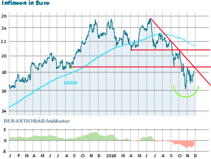 Die Infineon-Aktie hat bisher ein hartes Jahr hinter sich. Die schlechte Stimmung in der Halbleiterbranche hat das Papier trotz guter Zahlen nach unten gedrückt. Mittlerweile hat sich der Kurs von seinen Tiefstständen gelöst und kratzt wieder am seit dem Sommer gültigen Abwärtstrend. Mit dem nachhaltigen Sprung über den Abwärtstrend bei 18,20 Euro würde ein Kaufsignal mit ersten Zielen bei 19 und 21 Euro generiert. Risikobewusste Anleger setzen weiter auf dieses Szenario.