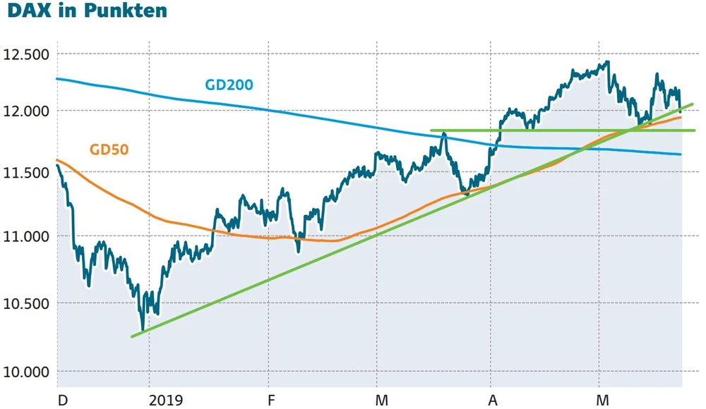 Der DAX startet mit einem großen Minus in den Donnerstag. Der Handelsstreit zwischen USA und China belastet die Stimmung. Zeitweise fällt der deutsche Leitindex unter die wichtige Unterstützung bei 12.000 Punkten, wo das Abstauberlimit für einen Turbo-Long-Optionsschein liegt. Das ist in der Zwischenzeit ausgeführt worden.