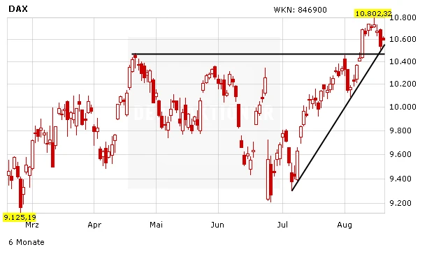 Technisch betrachtet hat der DAX am Mittwoch bis auf wenige Punkte die Unterstützungszone um 10.500 Zähler erreicht. Das Tief markierte er bei 10.516 Zählern. Im optimalen Fall könnte es hiermit mit der Konsolidierung schon gewesen sein. Entscheidend ist, dass der DAX sehr schnell das jüngste Verlaufshoch bei 10.802 Punkten überwindet.