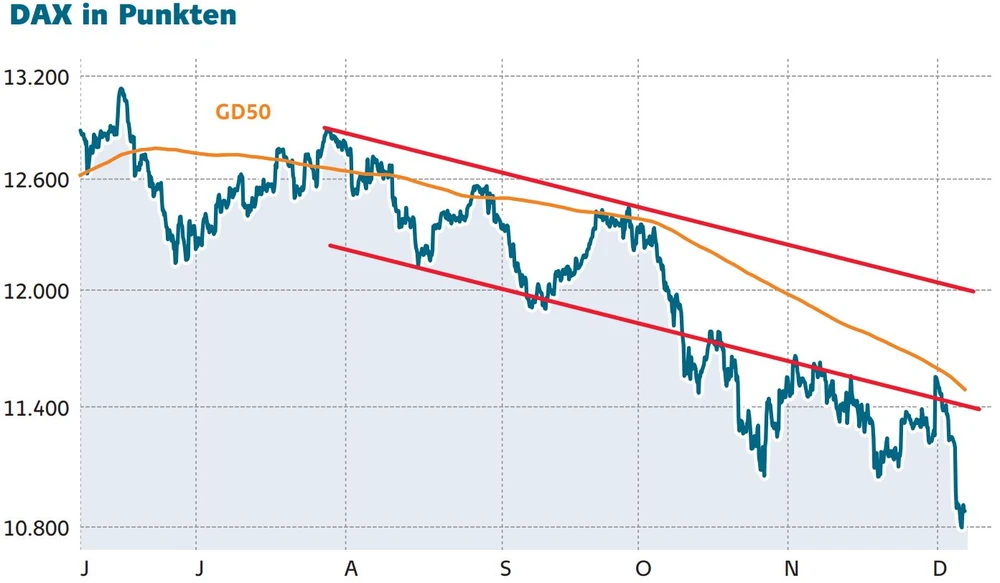 Nach den starken Verlusten am Vortag kommt es am Freitag zu einer leichten Erholung am deutschen Aktienmarkt. Zur Stunde kämpft der DAX mit der Marke von 10.900 Punkten. Aus Sicht der Charttechnik können Anleger damit aber noch lange nicht aufatmen.